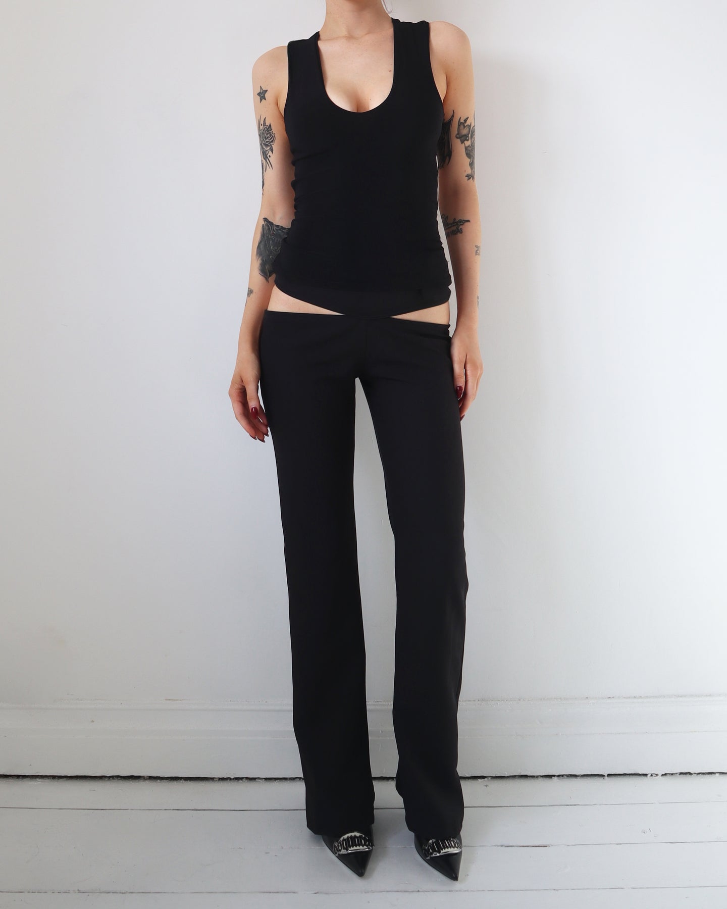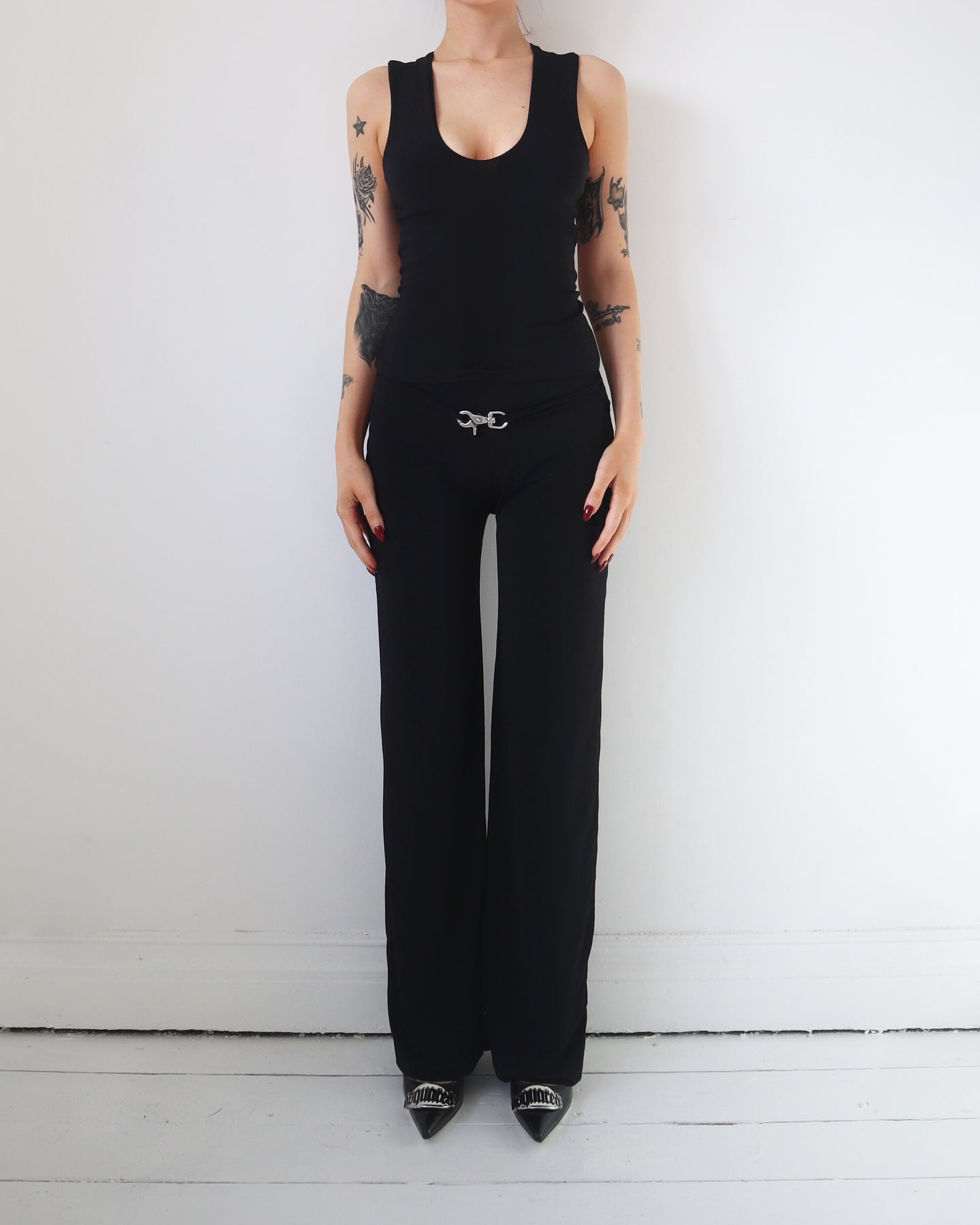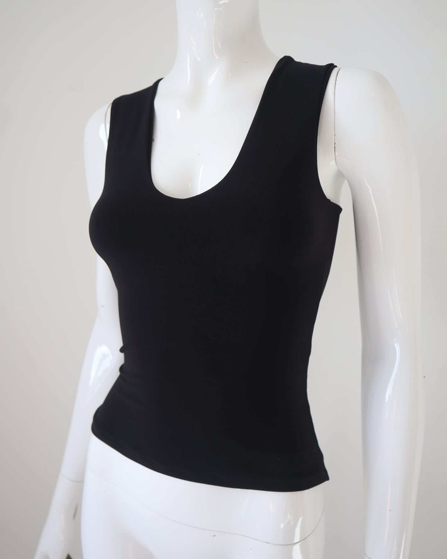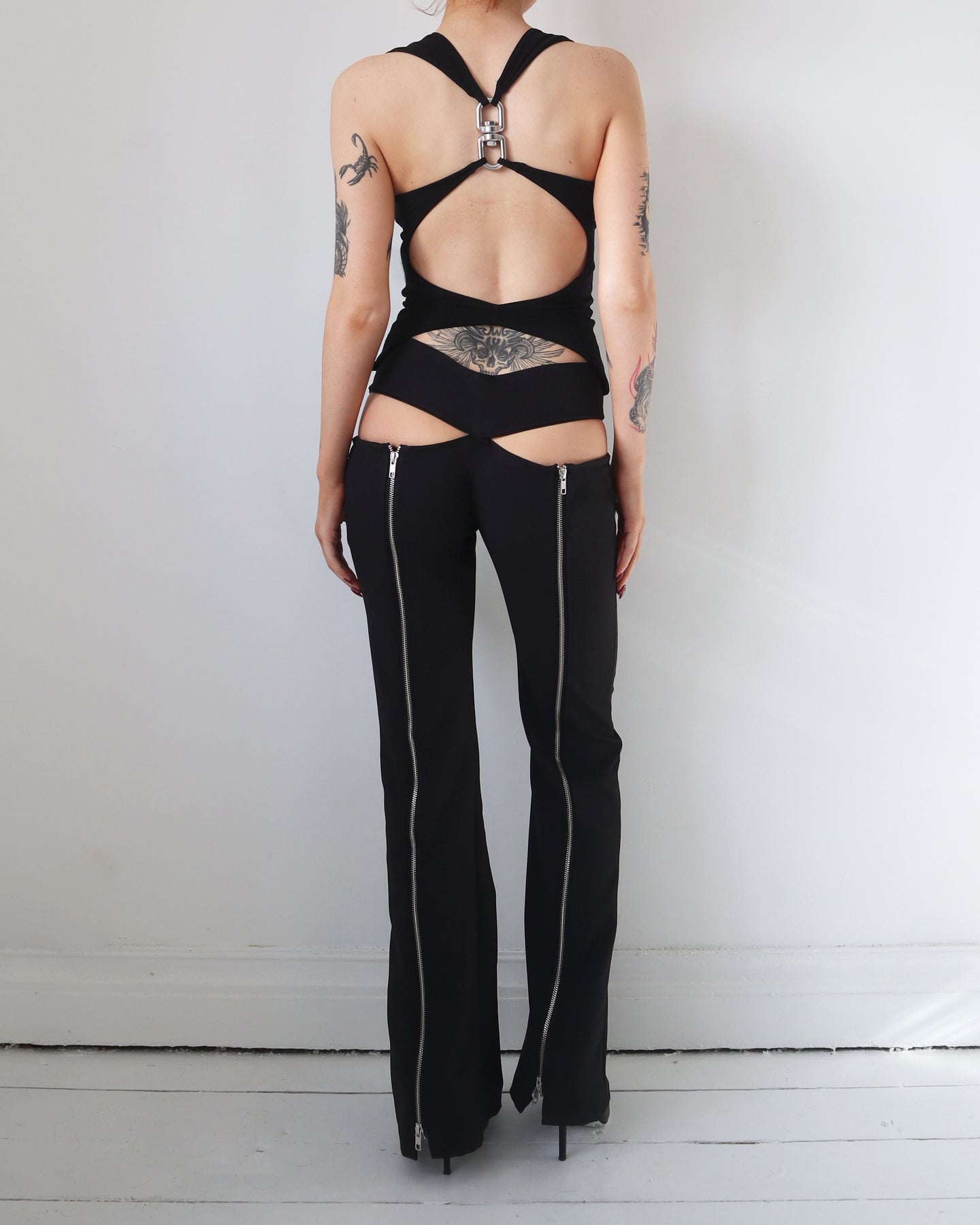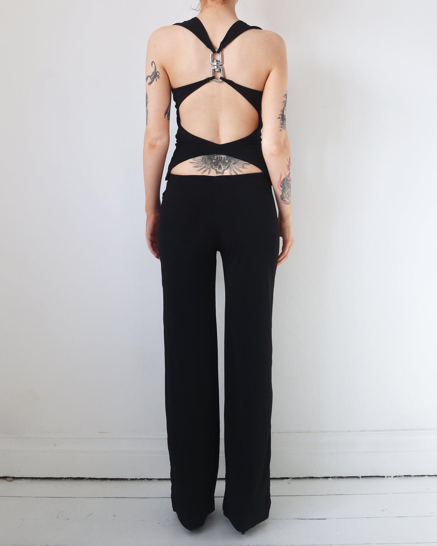 Tight fitted stretchy tank with low cut neckline. Backless design with silver hardware.